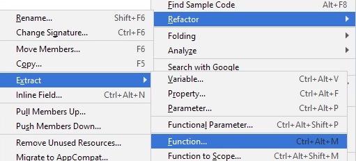 Agora vamos criar um método para colocar todo que é necessário passar para quando a Activity iniciar! Basta selecionar todas as linhas de código desejadas, clicar com botão direito Refactor -> Extract -> Function. De o nome para a função de “initTimer” e aperte OK: